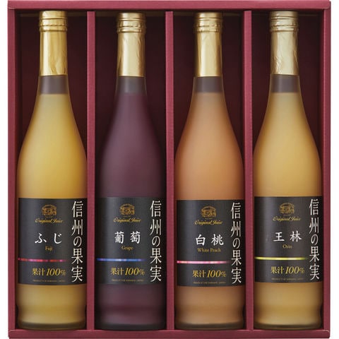 ●りんごジュース(ふじ)・葡萄ジュース・白桃ジュース・りんごジュース(王林)各500ml×各1(※りんご・白桃・葡萄:信州産)