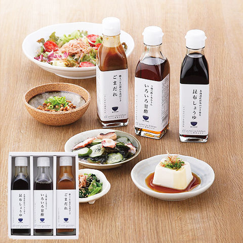 ●昆布しょうゆ235g、いろいろ甘酢220g、ごまだれ245g
