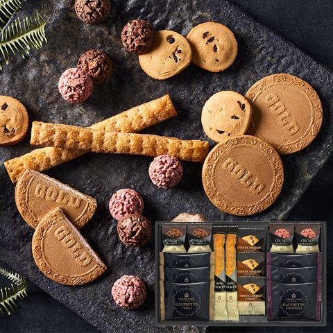●ロングスティックパイ×2、ゴーフレット(バニラ・ストロベリー)×各3、チョコクランチ(ミルク・ストロベリー)×各2、チョコチップクッキー×3