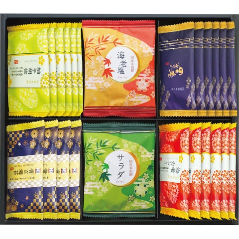 ●のり巻あられ×6、柚子胡椒煎餅×6、海老カレー煎餅×6、青さ海苔煎餅×4、海老塩煎餅×3、サラダ煎餅×3