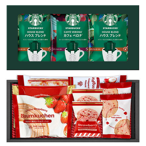 ●スターバックスオリガミドリップコーヒー(ハウスブレンド9g×3・カフェベロナ9g×2)、あまおう苺ロングスティックパイ、あまおう苺バウムクーヘン、あまおう苺ゴーフレット、焼きほろろイチゴクッキー×2、ストロベリーチョコクランチ×2