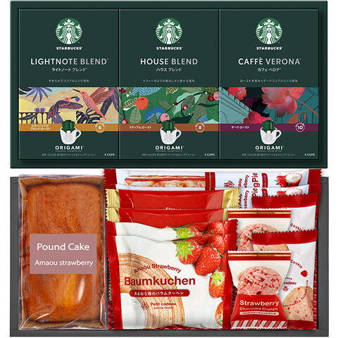 ●スターバックスオリガミドリップコーヒー(ハウスブレンド9g×4・カフェベロナ9g×4・ライトノートブレンド9g×4)、あまおう苺パウンドケーキ、あまおう苺ロングスティックパイ×2、あまおう苺バウムクーヘン×2、あまおう苺ゴーフレット×2、焼きほろろイチゴクッキー×2、ストロベリーチョコクランチ×2