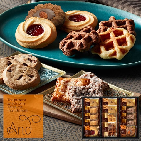 ■ブルーベリージャムをトッピングした甘酸っぱいロシアケーキやアーモンドをトッピングしたロシアケーキ、食感にアクセントをつけた、程よい甘さのプレーンワッフル、やわらかな生地に、カリカリとした食感がアクセントのチョコレート風味のチョコワッフル、パイ、クッキーなどを詰め合わせたこだわりのギフトです。
