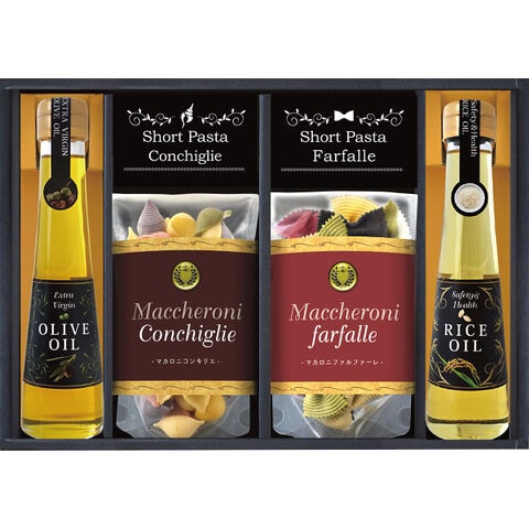 ●エクストラバージンオリーブオイル100g×1、ライスオイル110g×1、カラーパスタ(コンキリエ60g・ファルファーレ40g×各1)