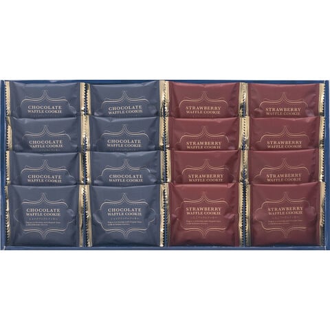 ■サクサク食感のワッフルクッキーにホワイトチョコクリームを詰めた風味豊かなショコラワッフルクッキーといちごチョコクリームを詰めたいちごワッフルクッキーの詰合せです。
