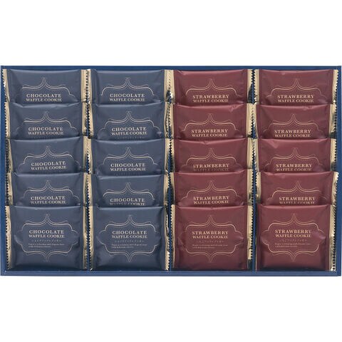 ■サクサク食感のワッフルクッキーにホワイトチョコクリームを詰めた風味豊かなショコラワッフルクッキーといちごチョコクリームを詰めたいちごワッフルクッキーの詰合せです。