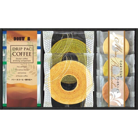 ●ミルクバウムクーヘン×1、宇治抹茶バウムクーヘン×1、ドトールドリップ珈琲(深煎りブレンド)7g×2、ドトールドリップ珈琲(キリマンジャロブレンド)7g×1、ミニバウムクーヘン(北海道生クリーム・ベルギーショコラ・宇治抹茶)×各1