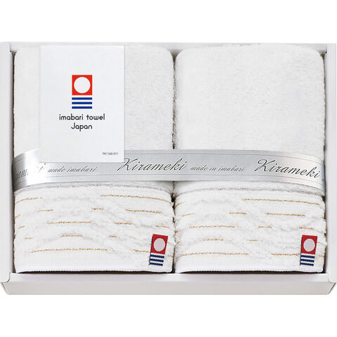 ■お肌になじみ、水分をしっかり吸収してくれるのでとても使いやすく贈り物に最適です。金糸・銀糸を使うことでさりげない豪華さと気品をそなえています。タオルの名産地「今治」から純白のタオルに気品をのせて。