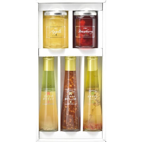 ●ジャム145g×2(りんご、いちご)、ドレッシング122ml×3(フレンチガーリック、ノンオイルゆずしょうゆ、イタリアンハーブ)