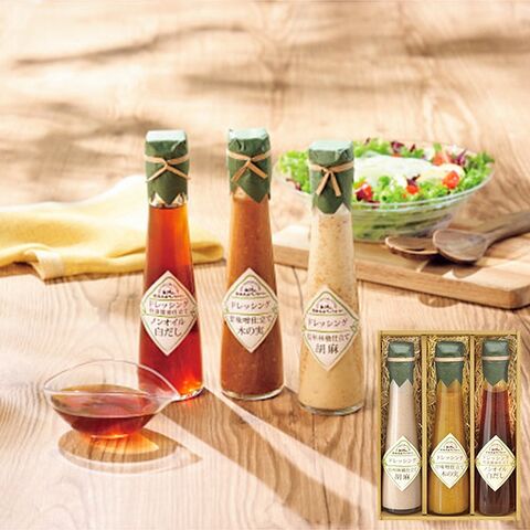 ●ドレッシング(信州林檎仕立て胡麻・甘味噌仕立て木の実)各120ml×各1、ドレッシングタイプ調味料(特選醤油仕立てノンオイル白だし)120ml×1