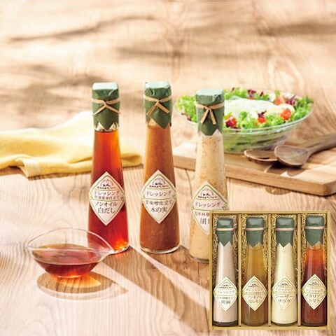 ●ドレッシング(信州林檎仕立て胡麻・2種のイタリア産チーズ仕立てシーザーサラダ・イタリアントマトのイタリアン)各120ml×各1、ドレッシングタイプ調味料(瀬戸内の花藻塩仕立てノンオイル塩レモン)120ml×1
