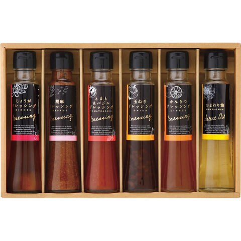 ●しょうがドレッシング・胡麻ドレッシング・とまと&バジルドレッシング・玉ねぎドレッシング・かんきつドレッシング各100ml×各1、ひまわり油90g×1
