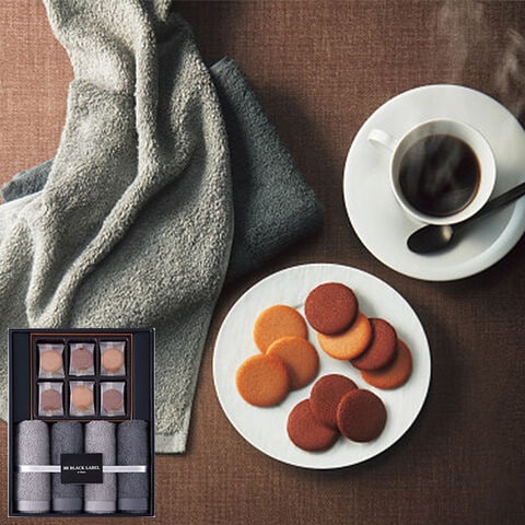 ■軽やかなラングドシャ生地で、チョコレートをサンドしたクッキー。「ミルクチョコレート」と「ダークチョコレート」、2種類のクッキーの詰め合わせと、柔らかな肌さわりとシルクの様な滑らかさでふんわり感が続くフェイスタオルのセットです。