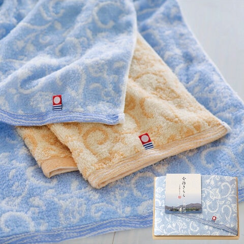 ■今治の自然を感じる色彩で丁寧に織り上げた情緒あふれる和更紗模様の今治タオル。美しい今治タオルを木箱に詰め合わせた丁寧な贈りものです。