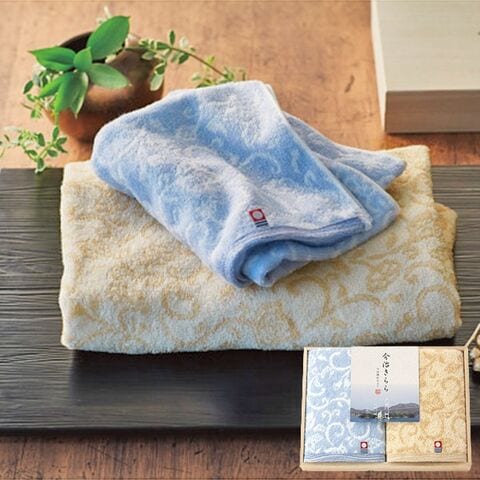 ■今治の自然を感じる色彩で丁寧に織り上げた情緒あふれる和更紗模様の今治タオル。美しい今治タオルを木箱に詰め合わせた丁寧な贈りものです。