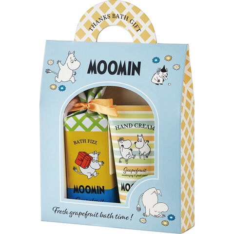 ■発泡タイプの入浴料とシアバター、ホホバオイル配合のハンドクリームのセット。ムーミン谷の仲間とリラックスタイムをお届けします。グレープフルーツの香り