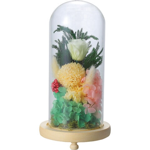 ■ガラス製ドームに包まれたプリザーブドフラワーのお供えアレンジメント。見た目に高級感があるだけでなく保護性能も高いため、さらに長期間お花を美しい状態に保つことが可能です。