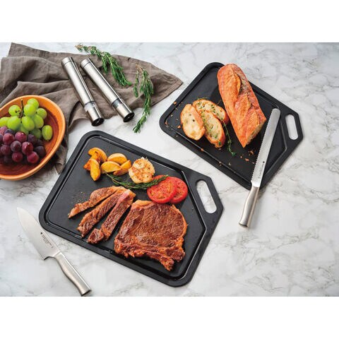 ■天然木の繊維を合成した特殊素材を使用しているため、耐久性に優れており、環境にも優しいまな板です。硬くしっかりとした素材なので、プラスチック製の製品と比べると深い傷はつきにくい丈夫な素材です。黒のまな板は溝がついており、パンを切った時に出るパンくずや肉料理の肉汁やソースなどが流れ出ないように受けてくれるので、テーブルを汚しません。