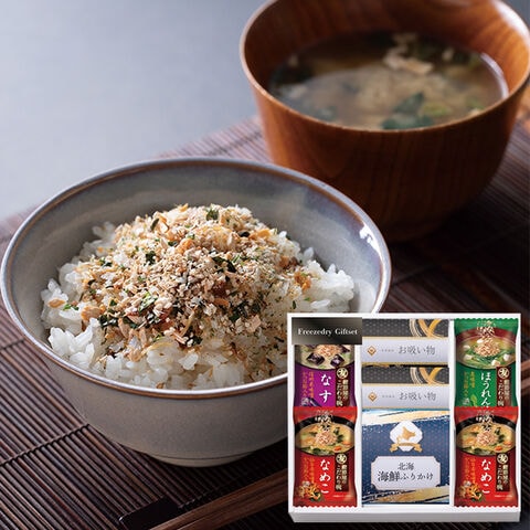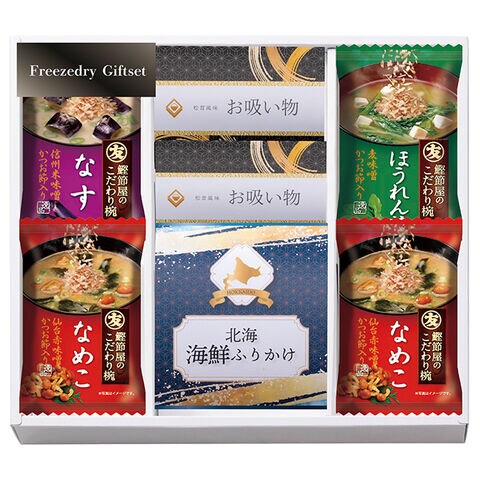 ●フリーズドライ味噌汁(なす)(7.4g)×1、フリーズドライ味噌汁(なめこ)(5.9g)×2、フリーズドライ味噌汁(ほうれん草)(7.5g)×1、北海海鮮ふりかけ(3g×2)×1、松茸風味のお吸い物(2.3g×2)×2