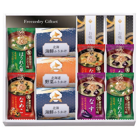 ●フリーズドライ味噌汁(なす)(7.4g)×2、フリーズドライ味噌汁(なめこ)(5.9g)×2、フリーズドライ味噌汁(ほうれん草)(7.5g)×2、北海海鮮ふりかけ(3g×2)×2、北海道野菜ふりかけ(3g×2)×1、松茸風味のお吸い物(2.3g×2)×2