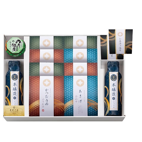 ●特級本醸造しょうゆ(300ml)×2、あさげ(8.4g×2)×2、鰹梅ふりかけ(2.5g×2)×3、わさびふりかけ(2.5g×2)×3、お茶漬け海苔(4.7g×2)×2、島乃香のり佃煮(80g)×1