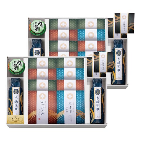 ●特級本醸造しょうゆ(300ml)×4、あさげ(8.4g×2)×4、鰹梅ふりかけ(2.5g×2)×6、わさびふりかけ(2.5g×2)×6、お茶漬け海苔(4.7g×2)×4、島乃香のり佃煮(80g)×2