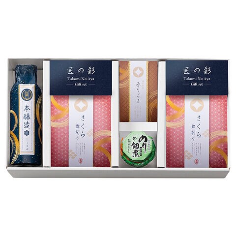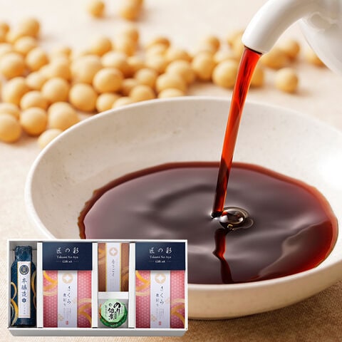 ●特級本醸造しょうゆ(300ml)×1、さくら舞削り(2g×2)×2、味付焙煎香りごま(2.5g×4)×1、島乃香のり佃煮(80g)×1