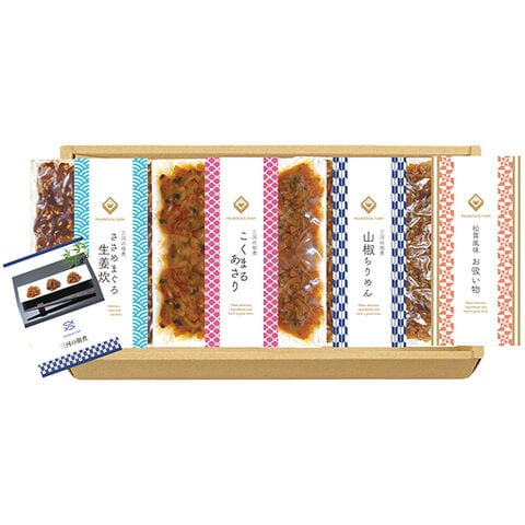 ●こくまるあさり(40g)×1、ささめまぐろ生姜炊(40g)×1、山椒ちりめん(40g)×1、お吸い物(2.3g×2)×1