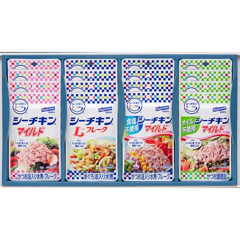 ●シーチキンSmileマイルド50g×4、シーチキンSmileLフレーク50g×4、シーチキンSmile食塩不使用マイルド50g×4、シーチキンSmileオイル不使用マイルド50g×4