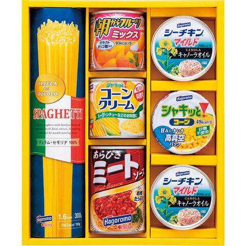 ●スパゲッティ300g×1、朝からフルーツミックス190g×1、シャキッと!コーンクリーム180g×1、あらびきミートソース290g×1、シーチキンマイルドキャノーラ70g×2、シャキッと!コーン65g×1