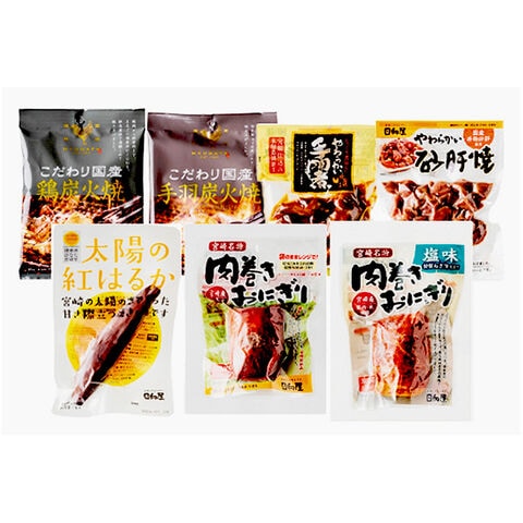 ●肉巻きおにぎりスタンドパック120g、肉巻きおにぎり塩味120g、こだわり国産鶏炭火焼80g、こだわり国産手羽炭火焼80g、じっくり煮込んだやわらかい手羽煮450g、やわらかい砂肝焼100g、太陽の紅はるか1本入り