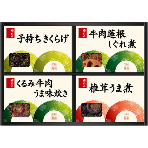 ●牛肉蓮根しぐれ煮50g、くるみ牛肉うま味炊き50g、子持ちきくらげ65g、椎茸うま煮60g