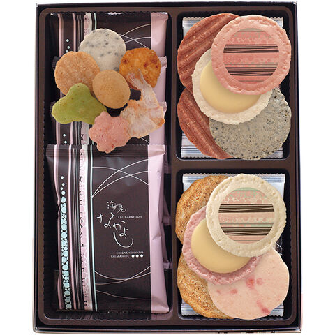 ●えびのだんらん×4袋、紅白せんべいチーズサンド×2袋、ふた焼辛子明太子×2袋、黒ごまえび煎餅×3袋、紅生姜えび煎餅×2袋、ふた焼ごま×3袋 計16袋入