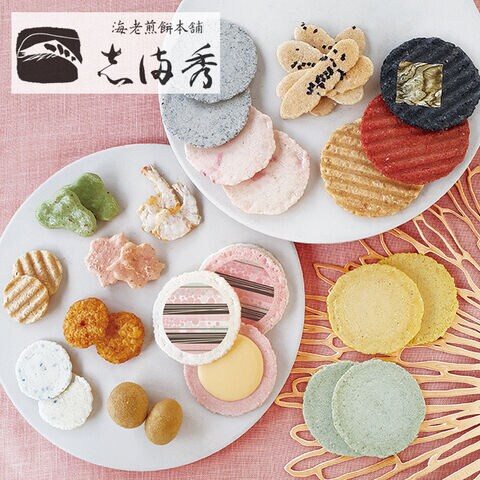 ●えびのだんらん×8袋、ふた焼イカスミ昆布×3袋、しょう油&山葵&椎茸×2袋、紅白せんべいチーズサンド×4袋、紅色のえびせんべい×5袋、ふた焼ごま×5袋、紅生姜えび煎餅×3袋、黒ごまえび煎餅×3袋、ふた焼辛子明太子×3袋、えび小笹×2袋、えび柚子胡椒×5袋、のりえびせん×5袋 計48袋入