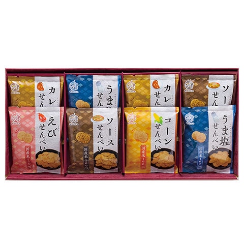 ●えびせんべい:15g×1個、コーンせんべい:15g×1個、うま塩せんべい:15g×2個、ソースせんべい:15g×2個、カレーせんべい:15g×2個