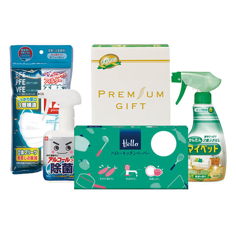 ●花王 かんたんマイペット400ml (本体)、レック 除菌の激落ちくん320ml (本体)、不織布マスク大人用12枚、ハローキッチンペーパー70枚 ×各1