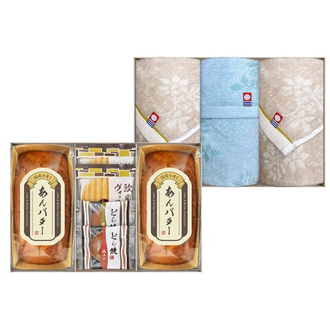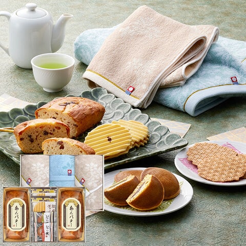 ●あんバターパウンドケーキ×2、欧風ヴァッフェル×2、どら焼き(粒あん、八女抹茶あん)、フェイスタオル(約34×75cm・綿100%)×2、ウォッシュタオル(約34×35cm・綿100%)