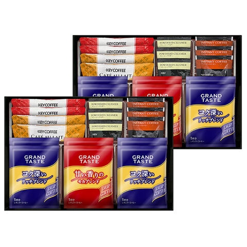 ●キーコーヒードリップ(リッチブレンド1杯分×8、モカブレンド1杯分×4)、キーコーヒースティック(カフェオレ7g×4、カフェモカ7.8g×4)、キーコーヒーインスタントコーヒー2g×6、キーコーヒークリーミーパウダー2.5g×6