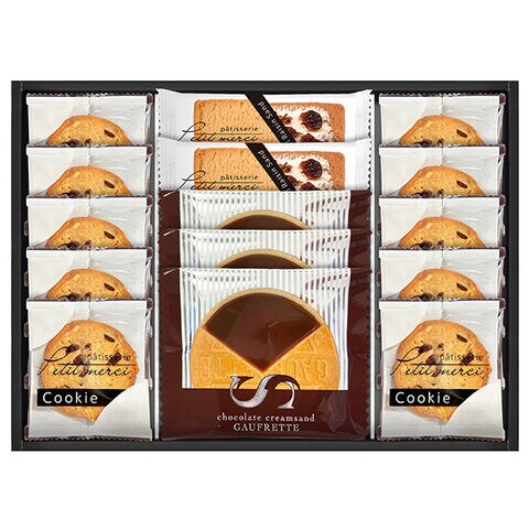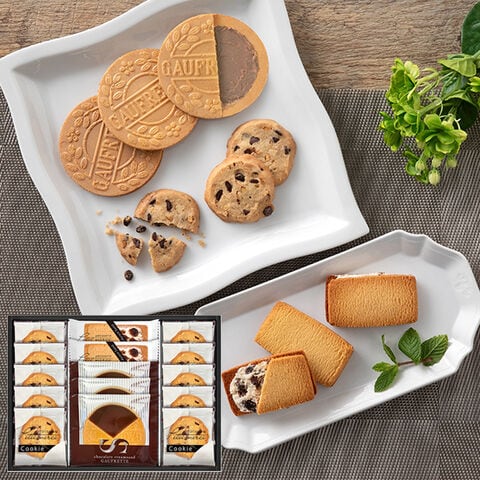 ■さくさくしたキャラメル味のクッキーでレーズンが練りこまれたクリームをやさしくサンドしました。マカダミアナッツとぺカンナッツ、チョコチップをたっぷり入れて、ざっくりとした食感に焼き上げたざっくりクッキーと上品な味わいに仕上げたチョコゴーフレットの詰め合わせです。