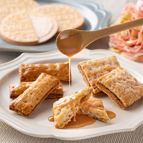 ■一口で甘さ広がる,キャラメル香るゴーフレット&パイで奏でる美味しさを届けるサクサク香ばしい贈り物。