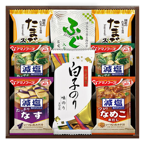●白子のり味のり(8切5枚)、ふぐ入お吸い物3.2g、アマノフーズ減塩いつものおみそ汁なす9.0g、アマノフーズ減塩いつものおみそ汁なめこ8.0g、アマノフーズ減塩いつものおみそ汁ほうれん草6.8g×2、たまごスープ6.4g×2