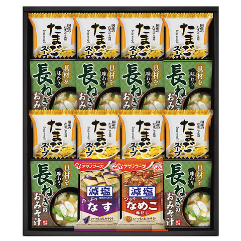 ●たまごスープ6.4g×8、具材を味わうおみそ汁長ねぎ×6、アマノフーズ減塩いつものおみそ汁なす9.0g、アマノフーズ減塩いつものおみそ汁なめこ8.0g