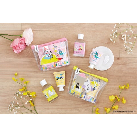 ■ムーミン谷の仲間たちが描かれたクリアポーチに、ミニサイズのハンドソープとハンドクリームが入ったセット。