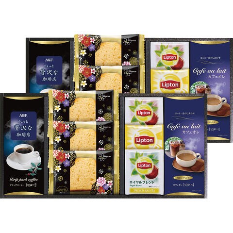 ●金澤兼六製菓オリジナルケーキ(プレーン)×6、リプトン イエローラベルティーバッグ2g・リプトン セイロンティーバッグ2.2g・リプトン ロイヤルブレンドティーバッグ2.2g・AGFちょっと贅沢な珈琲店スペシャルブレンド(ドリップ)(7g×2)・カフェオレ(スティック)(12g×4)×各2