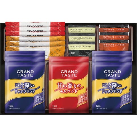 ●キーコーヒードリップ(リッチブレンド1杯分×6・モカブレンド1杯分×2)、キーコーヒースティック(カフェオレ7g×3・カフェモカ7.8g×3)、キーコーヒーインスタントコーヒー2g×3、キーコーヒークリーミーパウダー2.5g×3