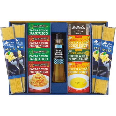●北海道小麦のパスタ80g×4、パスタシーズニング(バジリコ・ペペロンチーノ)各3g×各2、EXVオリーブ油90g×1、アンデスのピンク岩塩30g×1、北海道コーンスープ16.5g×2、北海道かぼちゃスープ16.5g×1
