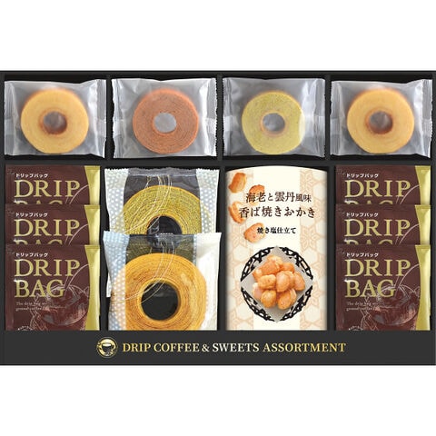 ●セイコー珈琲ドリップコーヒー8g×6、ミルクバウムクーヘン×1、宇治抹茶バウムクーヘン×1、ミニバウムクーヘン(北海道生クリーム)×2、ミニバウムクーヘン(ベルギーショコラ・宇治抹茶)×各1、海老と雲丹風味香ば焼きおかき40g×1