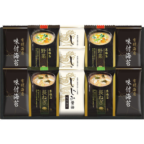 ●有明海産味付海苔(8切8枚)×4、しじみ醤油味付海苔(8切8枚)×3、マルコメ京懐石長ねぎのおみそ汁15.7g・マルコメ京懐石野菜のおみそ汁17.4g×各2