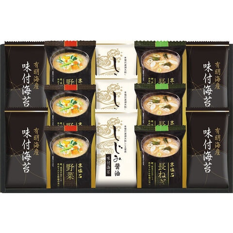 ●有明海産味付海苔(8切8枚)×4、しじみ醤油味付海苔(8切8枚)×3、マルコメ京懐石長ねぎのおみそ汁15.7g・マルコメ京懐石野菜のおみそ汁17.4g×各3