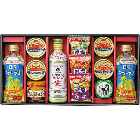 ●日清キャノーラ油350g×2、キッコーマン塩分ひかえめ丸大豆生しょうゆ450ml×1、アマノフーズ減塩いつものおみそ汁(なす・なめこ・ほうれん草)×各1、ニッスイ焼鮭ほぐし50g×1、ニッスイ紅ずわいがにほぐし身55g×4、島の香のり佃煮80g×1